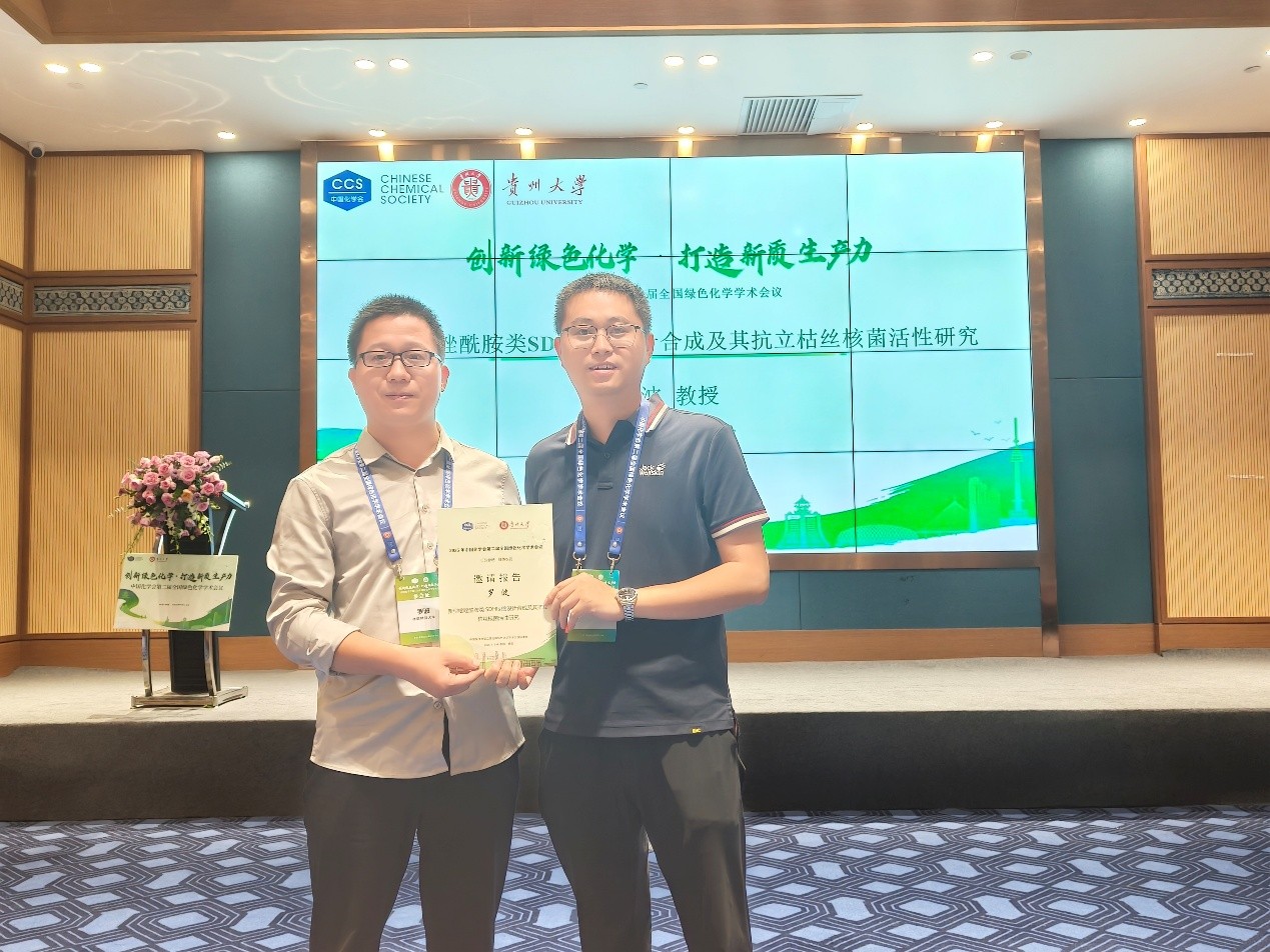 会议分为两个阶段:第一阶段为大会开幕式,第二阶段将举行六个专题分会,分别涵盖“高效绿色催化剂设计与催化反应”、“绿色反应路线与绿色产品”、“绿色化工科学与技术”、“绿色农药”、“绿色高分子材料化学”以及“育人育才研究生论坛”等议题。每个分会都将邀请相关领域的专家学者进行深入报告与交流。公司罗波博士应邀作了题为“新型吡唑酰胺类的设计合成及其抗立枯丝核菌活性研究”的学术报告,介绍了团队近3年来在新型绿色环保琥珀酸脱氢酶抑制剂的创制与应用方面所取得的系列成果。