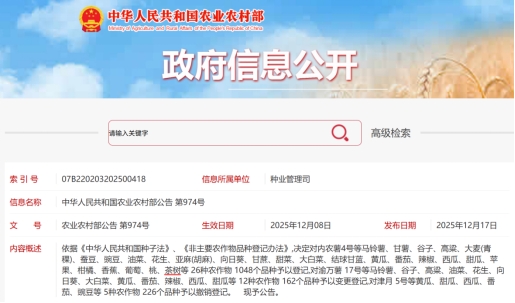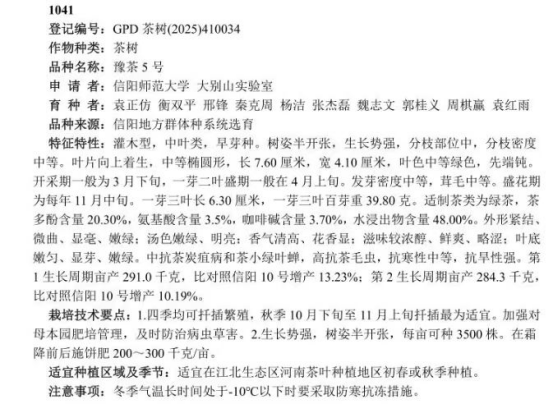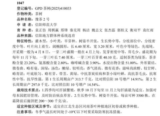 2025年12月17日,中华人民共和国农业农村部第974号公告,依据《中华人民共和国种子法》《非主要农作物品种登记办法》,决定对包含茶树在内的26种农作物1048个品种予以登记。其中包含bw必威西汉姆联官方网站、大别山实验室袁正仿团队选育的茶树新品种‘豫茶2号’‘豫茶5号’。