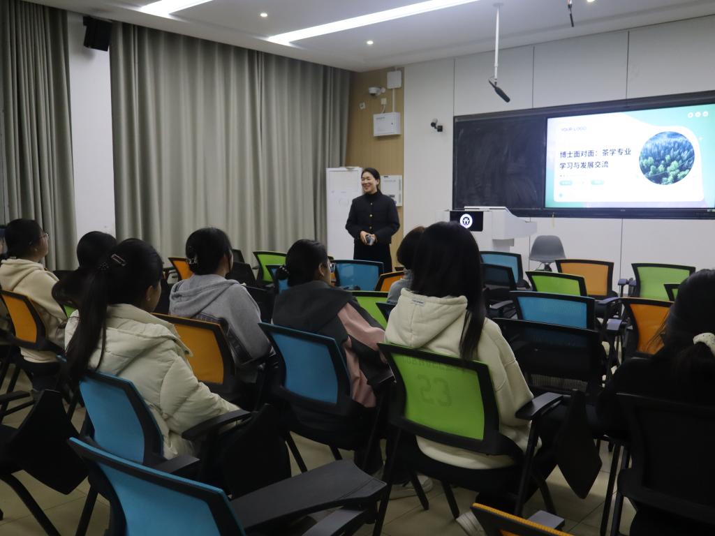 会议伊始,闫明慧博士以简洁明了的语言介绍了自己的教育背景、科研经历及研究方向,并热情邀请对茶学领域充满热情的同学加入她的实验室。随后,她深入剖析了茶学专业的就业方向,不仅涵盖了茶叶生产加工、茶企经营管理等传统领域,还拓展至茶叶深加工、茶旅融合开发等新兴领域。闫博士鼓励同学们在大学期间积极考取相关专业技能证书,培养跨学科能力,以增强自身竞争力。最后,她强调,进入大学后,同学们应主动学习,积极参与实验室工作、相关比赛及学科类创新创业项目,提升实践能力,实现自我成长。