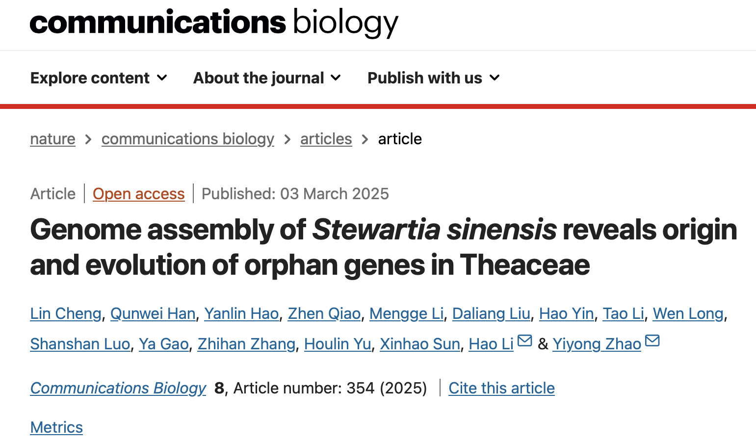 近日,公司程琳教授团队联合贵州大学赵义勇团队、华东师范大学李浩团队于2025年3月4日在国际著名期刊《Communications Biology》(中国科公司1区TOP,Nature子刊,IF=5.2)在线发表题为“Genome assembly of Stewartia sinensis reveals origin and evolution of orphan genes in Theaceae”的研究论文。