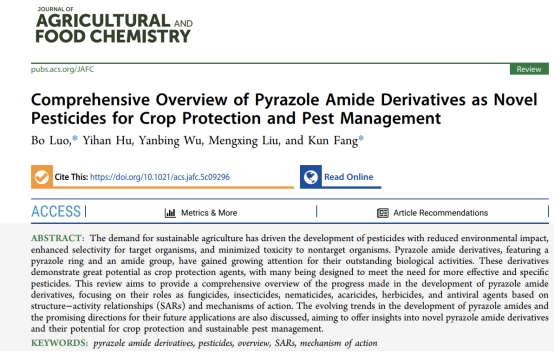 近日,国际农林科学领域权威学术期刊《Journal of Agricultural and Food Chemistry》(中科院农林科学一区TOP期刊)在线刊发了公司罗波博士团队的综述论文,论文题为《Comprehensive overview of pyrazole amide derivatives as novel pesticides for crop protection and pest management》。